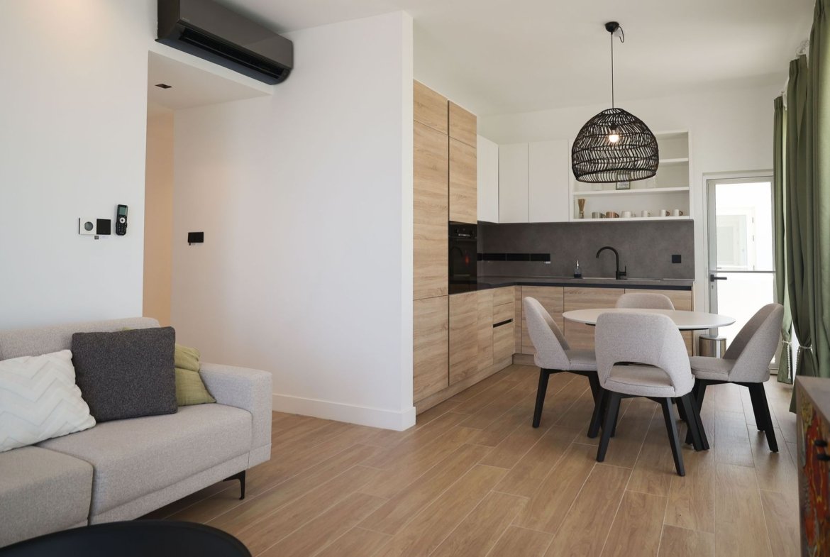 Discover a beautifully designed 2-bedroom, 2-bathroom apartment in the heart of Alsancak, where modern comfort meets natural elegance. Completed in 2023, this spacious 127 m² ground floor residence combines contemporary architecture with organic textures, creating a home that feels connected to both nature and community.