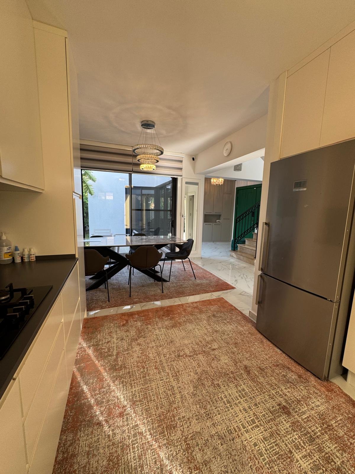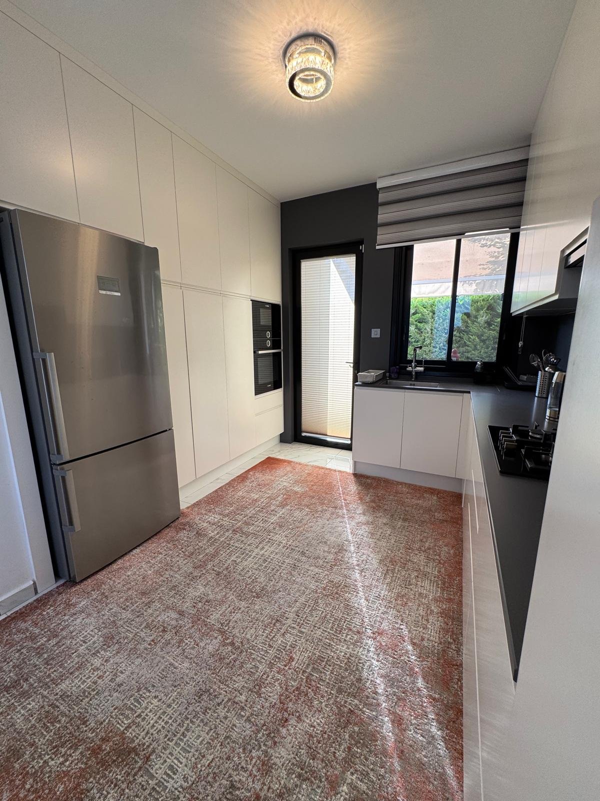 Outfitted with Bosch appliances including built-in oven, hob, refrigerator, dishwasher, and washing machine